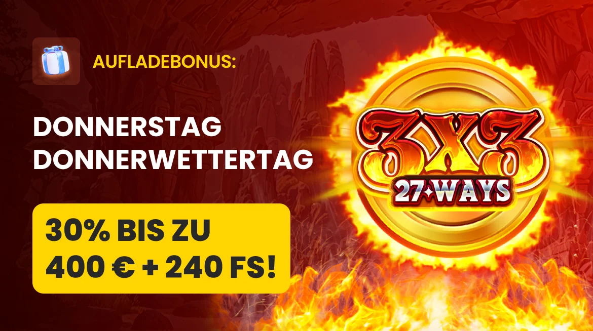 Donnerstag Donnerwettertag – 30% bis zu 400 € + 240 Freispiele