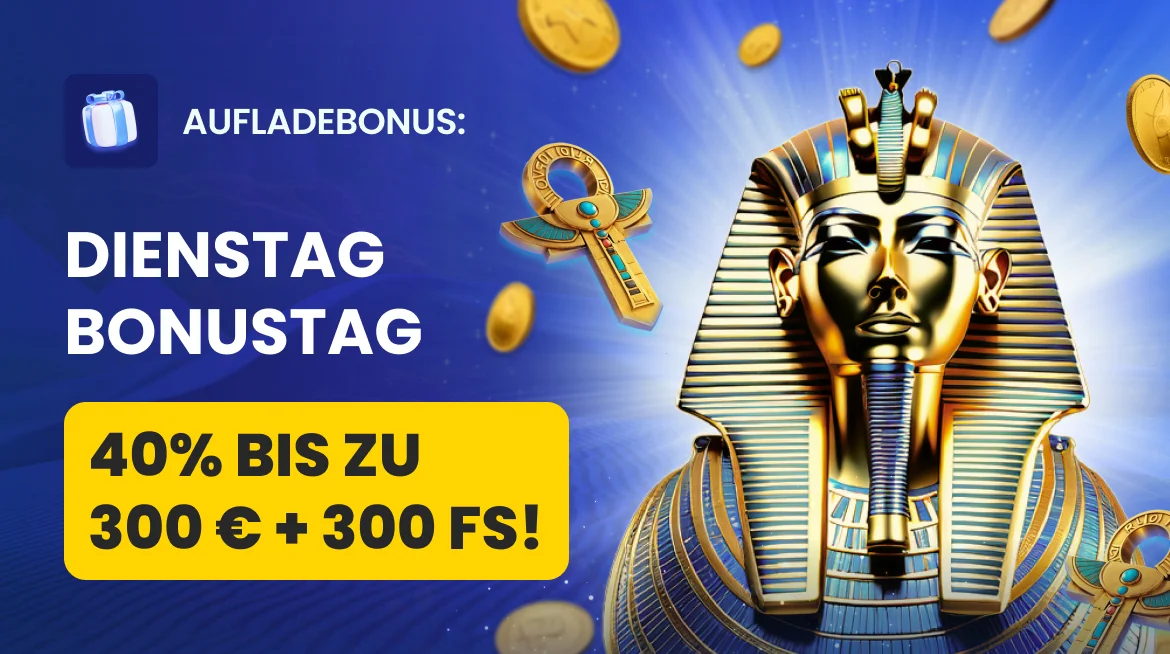 Dienstag Bonustag – 40% bis zu 300 € + 300 Freispiele